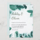 The intricate botanical border of green leaves creates a natural and timeless feel, perfectly complementing the ombre design. The majority of the text is in a stylish dark grey, adding sophistication and elegance to the invitation. The couple's names are highlighted in a dark green, matching the greenery on the border and adding a personal touch to the invitation.