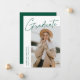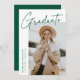 Modern graduation announcement card featuring one of the graduate's photos on the front with "Graduate" in a green handwritten script with a white background. Personalise with the graduate's name, school name, and graduation year. The minimalist graduation announcement reverses to display 4 photos in a grid-style layout with the graduate's future plans or other custom text shown below. The 5 photo graduation announcement is perfect for both high school and college graduates.