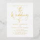 Invite family and friends to your wedding with this customisable wedding invitation postcard. It features simple hand-lettered calligraphy with classic typography. Personalise this calligraphy wedding invitation by adding your own event details. This gold foil wedding invitation postcard is perfect for any wedding theme and season.