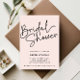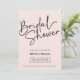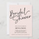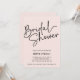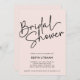 Minimalist bridal shower invitations featuring "Bridal Shower" at the top left, presented in a black calligraphy script against a blush pink background. Customise the pink bridal shower invitations with the name of the bride-to-be and shower party details below. The contemporary bridal shower invite can be flipped to reveal a solid pink background. Vertical version