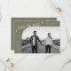 Modern and stylish save the date card featuring a modern typography text that says "save the date." One photo in the font and one on the back. The background is sage green.