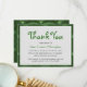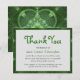 Irish themed thank you card featuring a classic white background, a green border, the text "Thank you" and a personalised thank you message from the family to send out to friends and family who have shown you kindess during your time of grief. On the back is a decorative fractal green clover design.