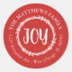 Affordable custom printed round return address stickers personalised with your family name and return address. This rustic modern holiday design features simple JOY lettering and branches on a red background. Use the design tools to change the background colour and fonts to further customise your own unique Christmas return address labels.