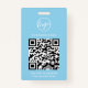 Custom ID name badge in a vertical layout with your logo and QR code. Use the template to add each employee name and title. The backside has your contact information and instructions for returning if found. This simple yet professional design features all text in white over a light blue background and may be changed to any colour you wish by clicking the "customise" button. This corporate style ID badge may be personalised for any type of business big or small.