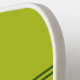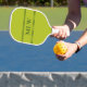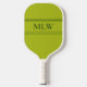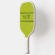 This acid green pickleball paddle has three white letters in the centre. You can change the letters to display the correct monogram. Two white horizontal lines are above and below the initials.