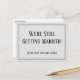 The front has a cheerful message declaring your news. "We're Still Getting Married!" Then, in smaller type, "(We're Just Not Sure When)". Accented with two slim borders, this text appears on a subtle light grey background you can change to any colour you prefer. The reverse side includes template placeholders for your details. Use these fields to add your personal details and change my draught wording to suit your needs and situation. Fully customisable, you are able to change your colours, fonts, sizes, and especially... your message.