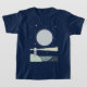 Simple minimalist island scene with lighthouse and full moon with stars by the calm sea.