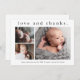 A sweet 3 photo collage birth announcement and thank you note card featuring a simple modern type and 3 pictures on the front. The back is a mailable postcard with a large full name header and personal message from the family. Click the edit button to customise this design with your photos and details.