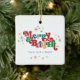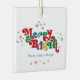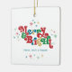 These 2.75" x 2.75" square ceramic ornaments feature a retro bright and colourful greeting, "Merry & Bright," in red, green, blue and gold with placeholders for your family name(s) and year.