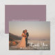 Minimalist photo wedding "Thank You" featuring a single large photo on front with names and wedding date and your unique message and signatures on back. Features a dusky lavender background on back. Template placeholder photo courtesy Unsplash. Design by Holiday Hearts Designs.
