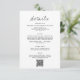 This wedding details card has a minimalist white background with black text, combining a script heading with clean sans serif fonts for a modern look. The layout is neatly organised into sections with clear spacing, and a QR code at the bottom adds a practical, contemporary touch.
