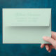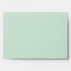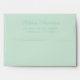 A simple mint green envelope. It has a lighter mint outside and a darker mint inside. The return address is printed on the flap, with the darker mint nuance, the name in an elegant calligraphic script.