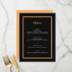 Simple modern black, and orange wedding flat menu. Celebrate in style luxuriously with this entire elegant collection, it will add a stunning touch to your event. Parts of this collection can be personalised. This collection is customisable. Enjoy your celebration, cheers!