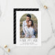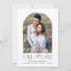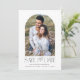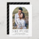 Announce your wedding date in style with our modern photo save the date. The simple save the date card features your engagement photo inside of a white arch frame. "Save the Date" is displayed in black modern serif and script fonts. Personalise the front of the save the date by adding your names, wedding date, and wedding location. The card reverses to display a black and white stripe pattern.