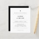 Simple black and white wedding invitation. Features modern font with pretty heart and a solid black background on the back.