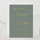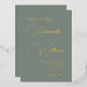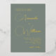 Simply beautiful, this modern stylish wedding invitation has real gold foil calligraphy script spelling out the bride and groom’s names on a deep sage green background. Wow your wedding guests with this stunningly elegant invitation. Personalise the text template with your information.