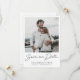 On the front, this simple, elegant modern photo wedding save the date flat card template features your first names, date and wedding locale under your photo and a unique 'Save our Date' message in handwriting that we first wrote by hand and then adapted for this card. The 'Save our Date' text is in standard black, and your details below it are a slightly softened black. You might choose to change the colour of the names text to gold or another colour, or change the colour of the other text. The 'Save our Date' design element can't be altered, as it's an image. But you can change the colour, size or font of any of the other text on either side.