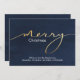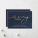 Classy and elegant navy blue watercolor background with gold effect fancy script text "merry" Christmas. Greet your family and friends with class and sophistication this holiday season with this stylish flat greeting card. Design Copyright © CustomChristmasPhotoCards.com