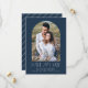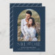 Announce your wedding date in style with our modern photo save the date. The simple save the date card features your engagement photo inside of a navy-coloured arch frame. "Save the Date" is displayed in white modern serif and script fonts. Personalise the front of the save the date by adding your names, wedding date, and wedding location. The card reverses to display a navy blue and white stripe pattern.