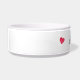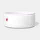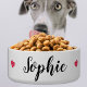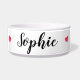 A simple yet cute ceramic dog bowl with watercolor hearts on each side of your dogs name .