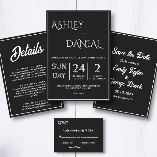 Make a statement with this timeless and classic black and white wedding invitation. The bold white typography on a black background creates a striking contrast and a unique look. Perfect for weddings, engagements, and other special occasions, this invitation will make a lasting impression. The simple, yet elegant design will be sure to stand out among the rest.
