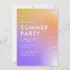 A modern summer party invitation featuring a purple, orange, yellow gradient as background. Use this invitation to invite your friends and family to your next summer party at your house. Use it for cocktail parties, happy hours, BBQs, housewarmings and more.