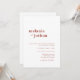 This simple, modern wedding invitation features a terracotta and white colour palette, a bold serif font for the couples' names, an elegant and classy sans serif font for the wedding invitation text, and a charming hand-written script font for a touch of extra elegance.
