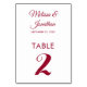 Simple and elegant minimalist wedding table number card featuring a stylish crimson red script over a classic plain white background. Easily customisable with the bride and groom's names, the wedding date, and the table number.