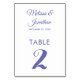 Simple and elegant minimalist wedding table number card featuring a stylish periwinkle purple script over a classic plain white background. Easily customisable with the bride and groom's names, the wedding date, and the table number.
