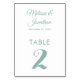 Simple and elegant minimalist wedding table number card featuring a stylish mint green script over a classic white background. Easily customisable with the bride and groom's names, the wedding date, and the table number.