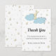 Cute and simple white baby shower thank you card with a starry night and yellow moon behind some blue clouds. The illustration is made so it looks in three dimensions but note that it's just an effect and this is actually a print. All the text is in grey and can be personalised. Illustrated and designed by Patricia Alvarez.
