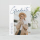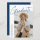 Modern graduation announcement card featuring one of the graduate's photos on the front with "Graduate" in a navy blue handwritten script with a white background. Personalise with the graduate's name, school name, and graduation year. The minimalist graduation announcement reverses to display 4 photos in a grid-style layout with the graduate's future plans or other custom text shown below. The 5 photo graduation announcement is perfect for both high school and college graduates.