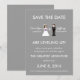 This fun and geek, yet simple and chic save the date wedding announcement features 8-bit bride and groom characters with purple accents gazing at each other against a silver grey background.