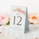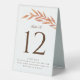 Sturdy and resilient to the elements, these tented table numbers feature an arched orange branch of leaves and elegant custom text to not only show your guests where to sit but also share a little of your story through the descriptive text below the number.