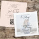 This design features a modern simple minimalist photo picture, QR code rsvp via the website, online scannable scan web digital, peach coral elegant calligraphy script text, great for engagement photo couple white overlay, classic traditional minimal simplistic, monogram ampersand back side, romantic calligraphy typography font, a chic overlay vellum style design, a modern simple rustic elegance romantic, with wedding details more information info