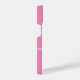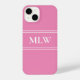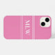 This pink iPhone case has three white letters in the centre. You can change the letters to display the correct monogram. Two white horizontal lines are above and below the initials.