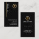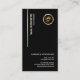 A simple creative design. In an all black background, a vertical faux gold line comes through from the top. Alongside it, is your prestigious name and job title. Eastwards of this is your optional logo. Directly below near the base of the card, are the business name and contact details.