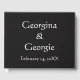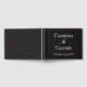 This customisable wedding guest book design features a simple, clean, plain appearance, with white text on a dark background. The names and date can be personalised.