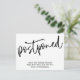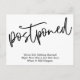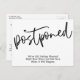 If you prefer bold and simple, this could be the announcement card for you. The front features a graphic header I designed using a modern, casual handwriting font, that reads "Postponed". Lower, there is a cheerful message you can edit, which declares your news: "We're Still Getting Married! Right Now We're Just Not Sure When it Will Happen." Use the template fields to add your personal details and change any of my draught wording to suit your needs and situation.
