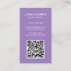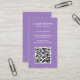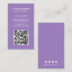 Modern vertical business card featuring a simple and minimalist style with your QR Code on the front and social media icons on the back. All design elements are in white over a light purple background. A plain and minimal design that can be customised for any business professional.