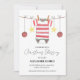 Announce the arrival of your festive bundle of joy with this charming Christmas-themed birth announcement card. Featuring an adorable red and white striped romper hanging on a clothesline adorned with Christmas ornaments and stars, this card beautifully captures the joy of the holiday season. The announcement proudly introduces the baby along with the birth details in an elegant script. Perfect for celebrating your little one as your merry little Christmas blessing. Personalise it to share the joyous news with friends and family, creating a keepsake that will be cherished forever.