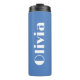 Simple minimalist blue thermal tumbler featuring your name in a fun retro text. Fully editable, including tumbler base colour, and text wording, colour, size, and style. Select "Personalise this template", and make your desired changes, or you can order this tumbler as is. Shown is the name, Olivia, in white retro text on an blue tumbler with black lid. A personalised tumbler makes a wonderful gift for your wedding party, weekend guests, family reunion, bachelor or bachelorette party, or for a girls' night out! From 369MyName.
