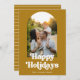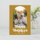 A retro holiday card your photo in an arch shape, and "Happy Holidays" in bold retro white type, on a mustard yellow/gold background. The reverse features white horizontal stripes.