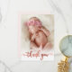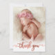 Modern Elegant Calligraphy Rose Gold Script Photo Newborn Baby Girl Thank You Card. Features a beautiful "thank you" text in a handwritten calligraphy swash tail font script in faux rose gold foil (or blush pink foil). At the reverse side pre-made personal message on blush pink background. Great for baby girl. Easy to personalise with your baby photo and details.