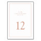 Simple wedding table number featuring an elegant and timeless design with your two letter monogram, names, date and table number surrounded a thin border. All design elements are faux rose gold over a white background and may be changed to any colour you wish in the design editing tool. A clean and classic design perfect for a couple who wants a traditional style table number with a modern touch. Add each table number to your cart individually.
