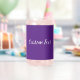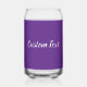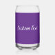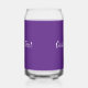 This royal purple can glass has text in a white script. The text can be edited or deleted.