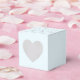 Tiny House Ink Drawing Light Blue Housewarming Party Square Favour Box with Heart Window. Personalise it with a name or customised text. This image is from my original ink on mylar hand drawing of a small rustic cottage with charming architectural details and small stone benches each side of door. The house is set into a hillside with natural landscaping and stone walls on each side.