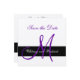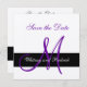 Black stripe with purple initial on a metallic silver paper stock. Simple Save the Date Card with monograms. Elke Clarke© Designed for the Monogram Gallery. The template save the date announcement is fully customisable with the font style, colours, paper sizes and paper stock. Matching items in the store. Contact luxuryweddinginvitations@gmail.com for help.