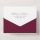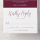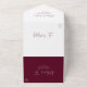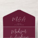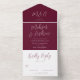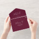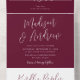 Modern wedding invitation featuring your monogram initials, names, and wedding details in a simple white script with a burgundy background. The burgundy all-in-one wedding invitation includes an RSVP postcard.