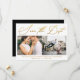 Simple faux gold "save the date" calligraphy script with two photos and a black back, modern and minimal save the date card.